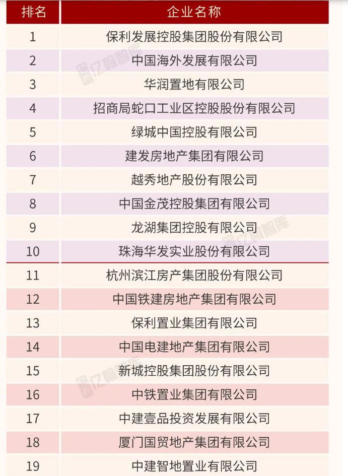 根据公布的2026中国房企综合料力TOP100榜单显示,排名前十的分别为保利发展控股集团、中国海外发展有限公司、华润置 地有限公司、招商局蛇口工业区控股股份有限公司、绿城中国控股、建发房地产集团、越秀地产、中国金茂控股、龙湖集团、珠海华发实业股份有限公司。