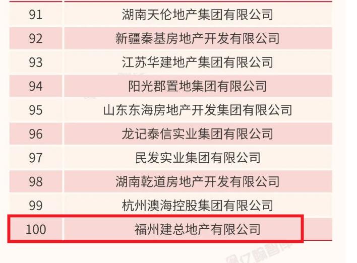 福州建总地产有限公司排名第100位。建总地产是福州城投集团旗下、福州市城乡建总集团全资控股的市属国企。成立于2019年6月14日,是福州楼市中的知名市属国企品牌。