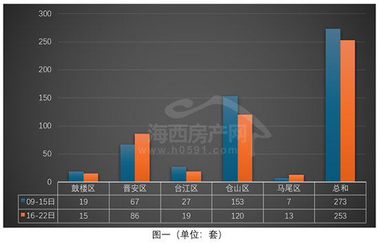 图一为2026年3月9日-22日福州五行政区住宅签约套数对比图。上周福州五区住宅签约253套,环比前一周减少20套。