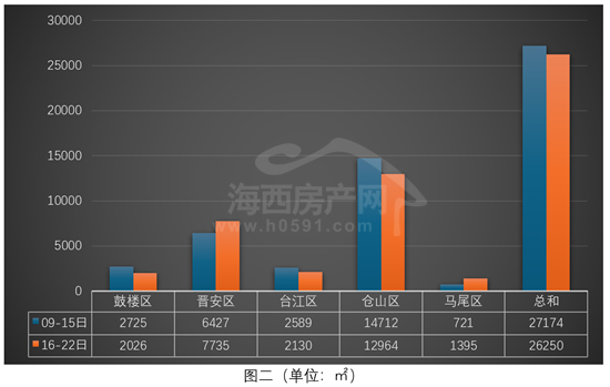 图二为2026年3月9日-22日福州五行政区住宅签约面积对比图。上周福州五区住宅签约26250㎡,环比前一周减少924㎡,降幅为3.4%。