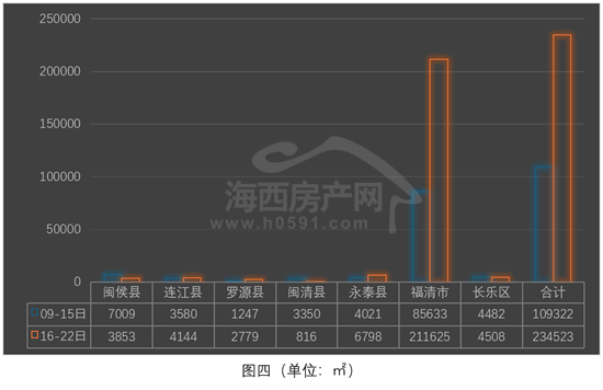 图四为2026年3月9日-22日福州下辖七县(市)区住宅签约面积对比图。上周七县(市)区住宅签约234523㎡,环比前一周增加125201㎡,环比增幅高达114.52%。