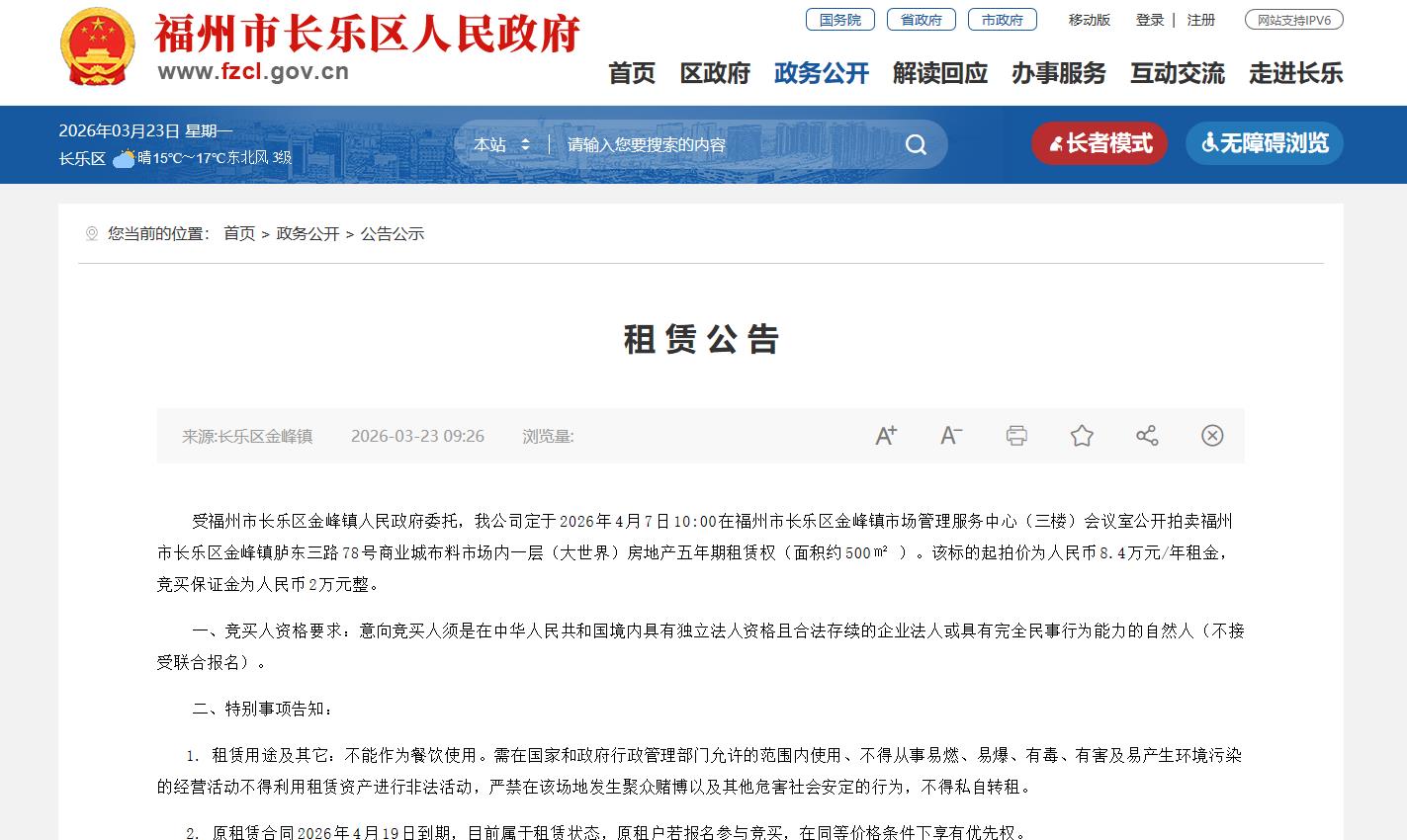 受福州市长乐区金峰镇人民政府委托,我公司定于2026年4月7日10:00在福州市长乐区金峰镇市场管理服务中心(三楼)会议室公开拍卖福州市长乐区金峰镇胪东三路78号商业城布料市场内一层(大世界)房地产五年期租赁权(面积约500㎡ )。该标的起拍价为人民币8.4万元/年租金,竞买保证金为人民币2万元整。