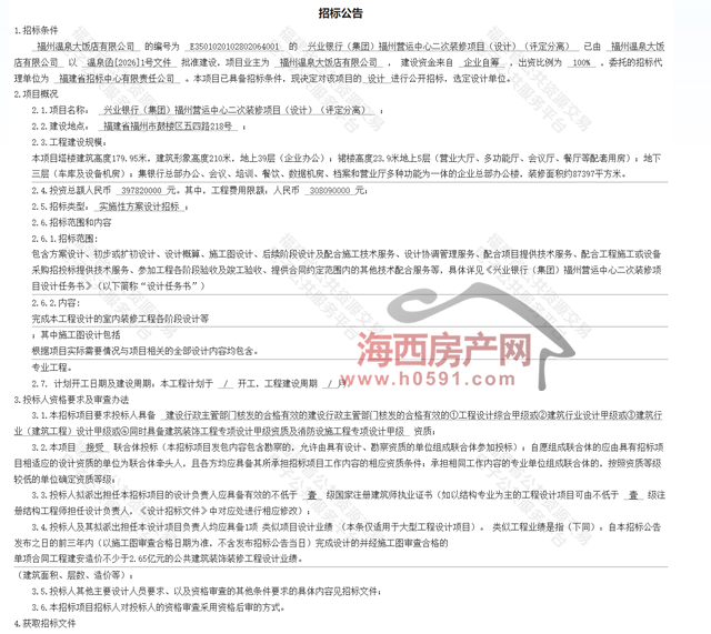 招标公告显示,兴业银行(集团)福州营运中心二次装修项目(设计)招标已经获批,项目已具备招标条件,现决定通过公开招标方式,选定设计单位。