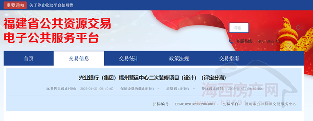 海西房产网(微信公众号:fjhxfcw)消息:3月23日,福建省公共资源交易电子公共服务平台发布“兴业银行(集团)福州营运中心二次装修项目(设计)(评定分离)招标公告”。