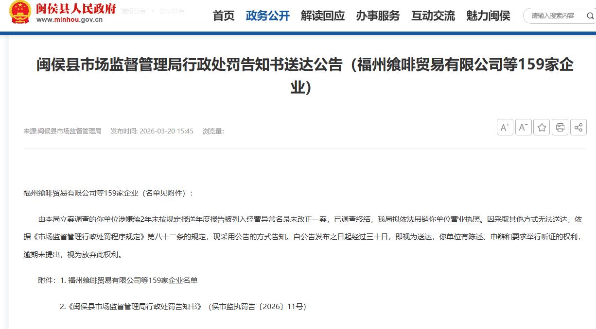 海西房产网(微信公众号:fjhxfcw)消息:2026年3月20日,闽侯县市场监督管理局发布“行政处罚告知书送达公告(福州飨啡贸易有限公司等159家企业)”。