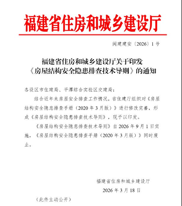 海西房产网(微信公众号:fjhxfcw)消息:2026年3月18日,福建省住房和城乡建设厅发布“关于印发《房屋结构安全隐患排查技术导则》的通知 ”。