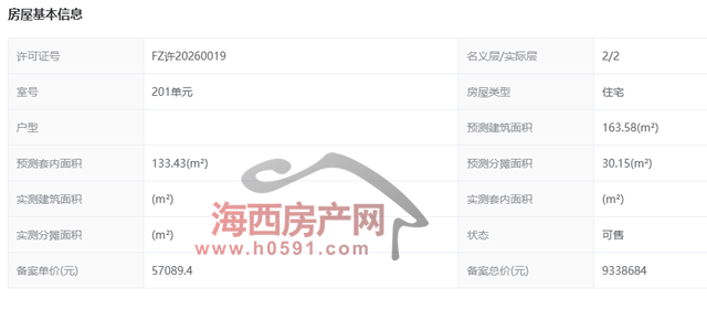 室号:A7#楼201单元;预测建筑面积:163.58m²;预测套内面积:133.43m²;预测分摊面积:30.15m²;备案单价:57089.4元/㎡;备案总价:9338684元。