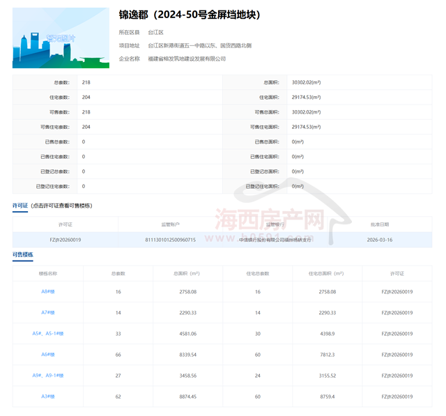 海西房产网(微信公众号:fjhxfcw)消息:福州市不动产登记交易平台公布信息显示,锦逸郡(2024-50号金屏垱地块)首批房源已于3月16日取得预售许可证。