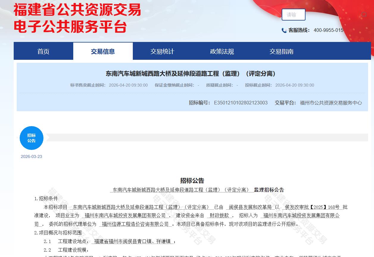 海西房产网(微信公众号:fjhxfcw)消息:2026年3月23日,福州市公共资源交易服务中心发布“东南汽车城新城西路大桥及延伸段道路工程(监理)(评定分离)”。