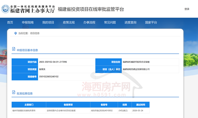 “福建省机械研究院综合实验楼”项目法人单位为福建省榕圣建设发展有限公司,备案号“闽发改备[2026]A010032”。