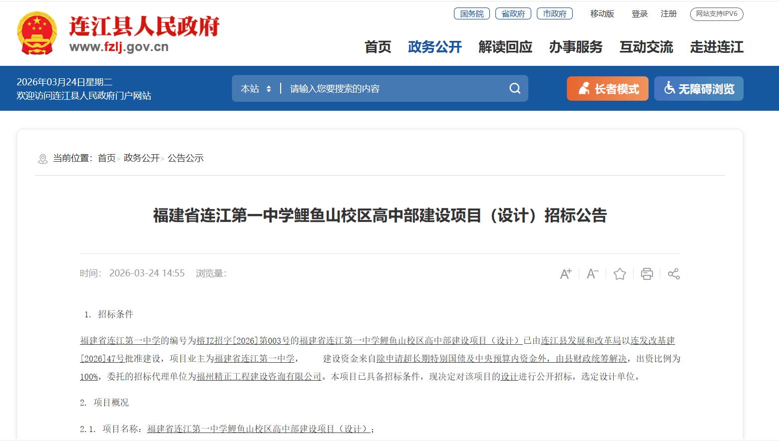 福建省连江第一中学的编号为榕JZ招字[2026]第003号的福建省连江第一中学鲤鱼山校区高中部建设项目(设计)已由连江县发展和改革局以连发改基建[2026]47号批准建设,项目业主为福建省连江第一中学, 建设资金来自除申请超长期特别国债及中央预算内资金外,由县财政统筹解决,出资比例为100%,委托的招标代理单位为福州精正工程建设咨询有限公司。本项目已具备招标条件,现决定对该项目的设计进行公开招标,选定设计单位。