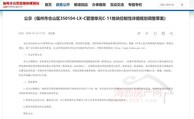 公示内容显示,仓山区350104-LX-C管理单元C-11地块东至郭宅路、南至郭宅南路。该控制性详细规划草案经研究审议,根据《中华人民共和国城乡规划法》等相关规定,现广泛征求社会各界意见,公示时间2026年3月24日至2026年4月23日。