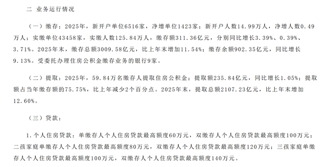 (一)缴存:2025年,新开户单位6516家,净增单位1423家;新开户人数14.99万人,净增人数0.49万人;实缴单位43458家,实缴人数125.84万人,缴存额311.36亿元,分别同比增长3.39%、0.39%、3.71%。2025年末,缴存总额3009.58亿元,比上年末增加11.54%;缴存余额902.35亿元,同比增长9.13%。受委托办理住房公积金缴存业务的银行9家。