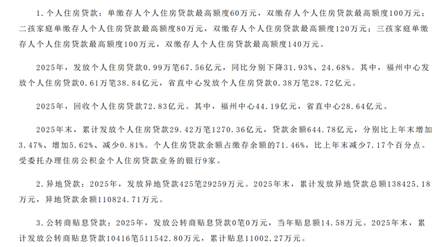 2025年末,个人住房贷款不良贷款余额3555.05万元,不良率0.0551%,其中:福州中心0.0552%,省直中心0.0550%。个人贷款风险准备金余额260053.43万元。2025年,使用个人贷款风险准备金核销呆坏账0万元。