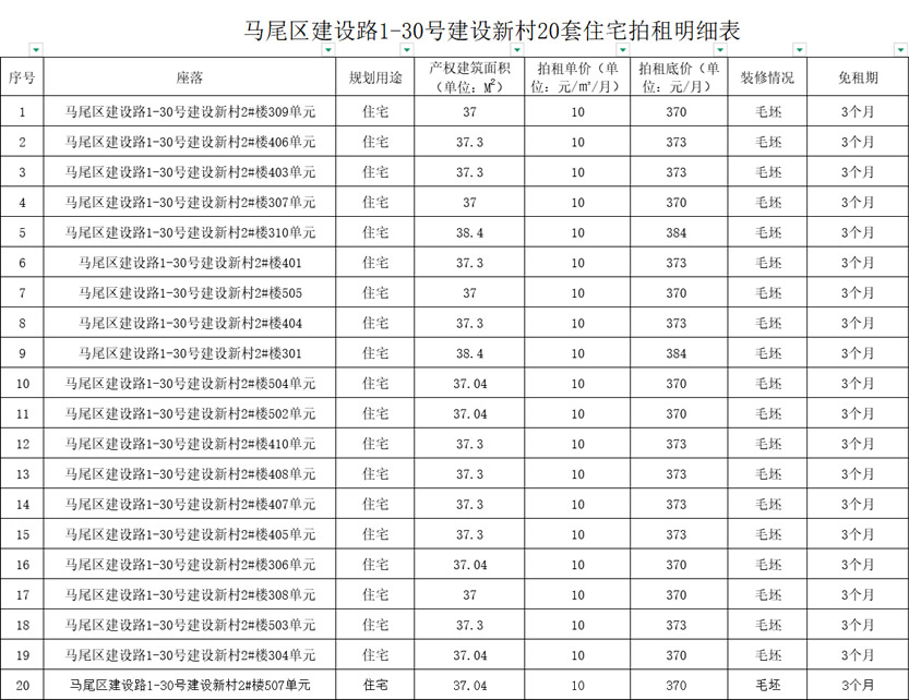 以上20套房源均为马尾区建设路1-30号建设新村2#楼,产权建筑面积为37-38平米左右。总建筑面积745.7平方米。每套房源的拍卖单价为10元/㎡/月,拍租底价从370-384元/月。装修情况为毛坯 ,免租期为3个月。