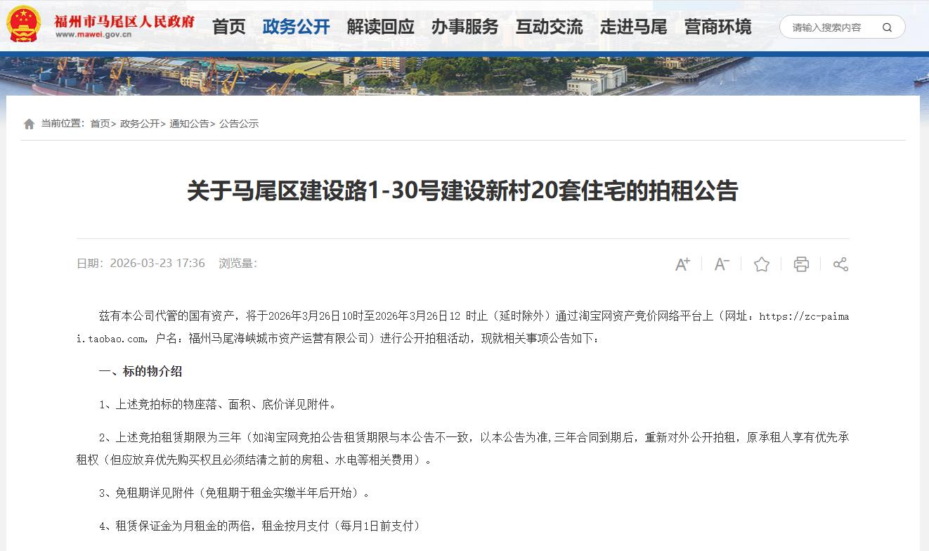 兹有本公司代管的国有资产,将于2026年3月26日10时至2026年3月26日12 时止(延时除外)通过淘宝网资产竞价网络平台上(户名:福州马尾海峡城市资产运营有限公司)进行公开拍租活动,现就相关事项公告如下: