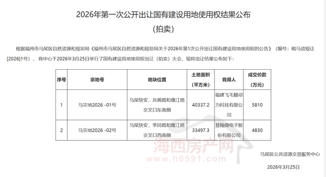 3月25日下午,马尾区公共资源交易服务中心公布2026年第一次公开出让国有建设用地使用权结果。
