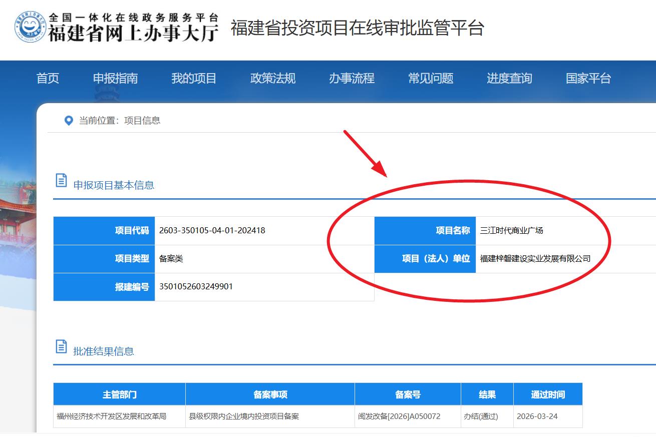 海西房产网(微信公众号:fjhxfcw)消息:福建省投资项目在线审批监管平台发布信息显示,“三江时代商业广场”已于2026年3月24日取得县级权限内企业境内投资项目备案,批准结果信息为办结(通过)。