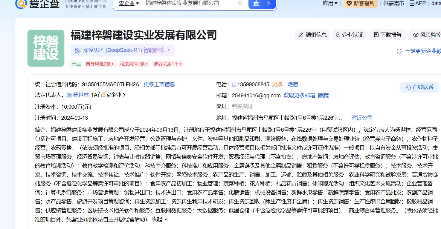 爱企查显示,福建梓磐建设实业发展有限公司成立于2024年9月,注册地址位于马尾区上岐路,注册资本1亿元。该公司系福建世晨投资有限公司全资子公司。