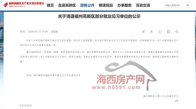海西房产网(微信公众号:fjhxfcw)消息:3月25日,福州高新区人事人才公共服务中心发布“关于清退福州高新区部分就业见习单位的公示”。