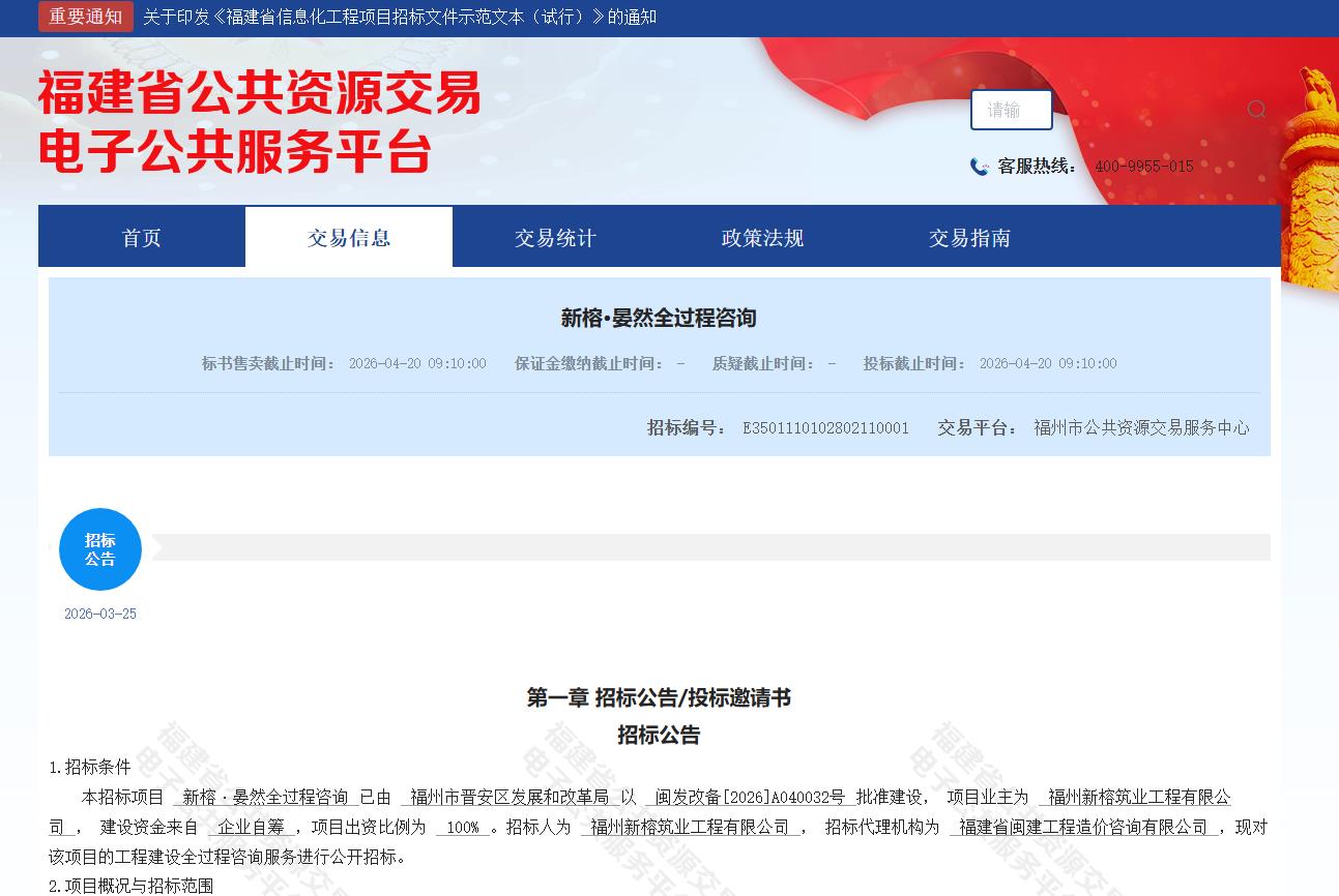 2026年3月25日,福州市公共资源交易服务中心发布“新榕·晏然全过程咨询”招标。