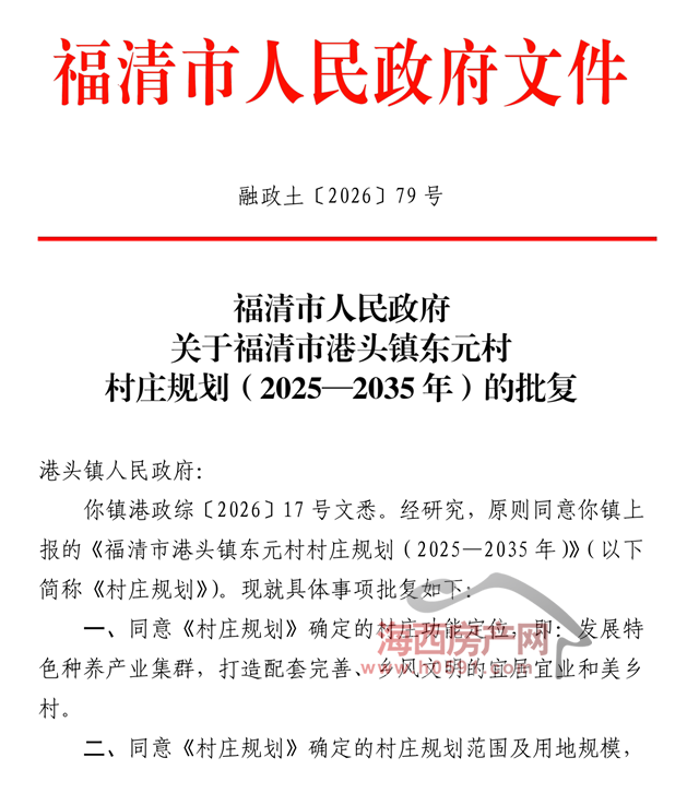 海西房产网(微信公众号:fjhxfcw)消息:3月25日,福清市人民政府发布“关于福清市港头镇东元村村庄规划(2025—2035年)的批复(融政土〔2026〕79号)”。
