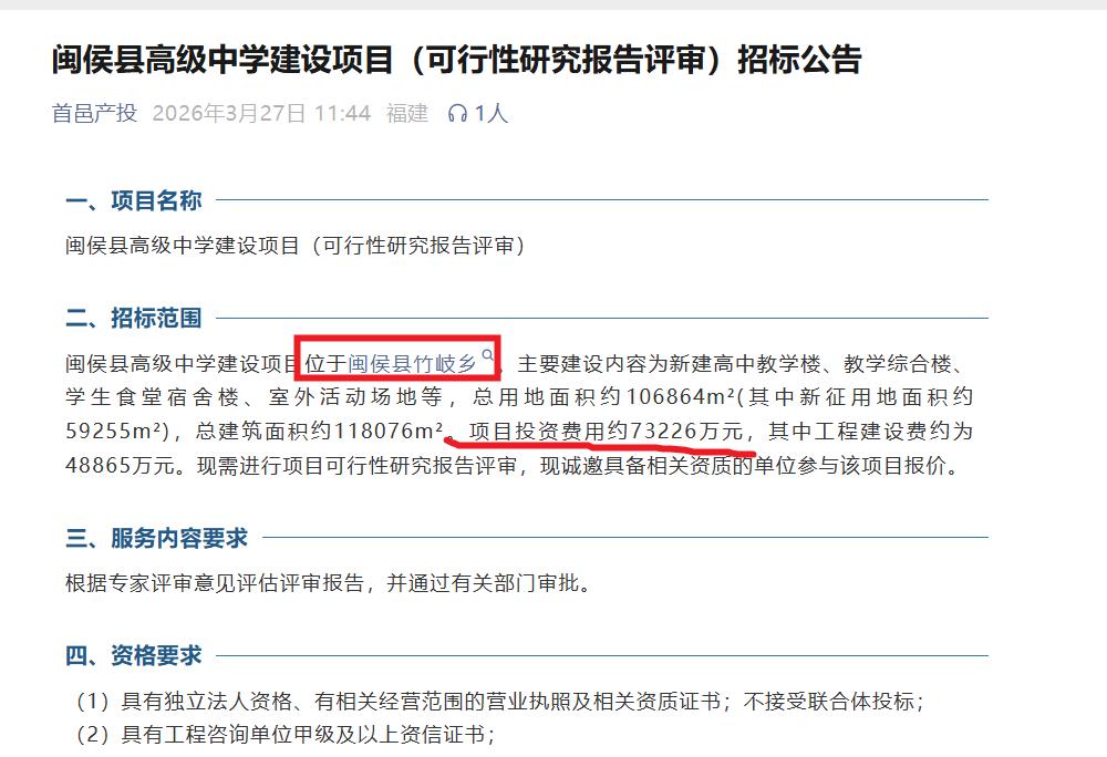2026年3月27日,首邑产投发布“闽侯县高级中学建设项目(可行性研究报告评审)”。