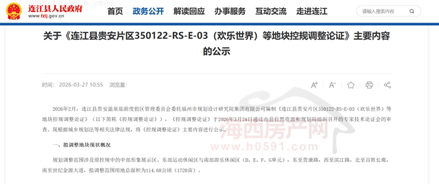 公示内容显示,2026年2月,连江县贵安温泉旅游度假区管理委员会委托福州市规划设计研究院集团有限公司编制《连江县贵安片区350122-RS-E-03(欢乐世界)等地块控规调整论证》。