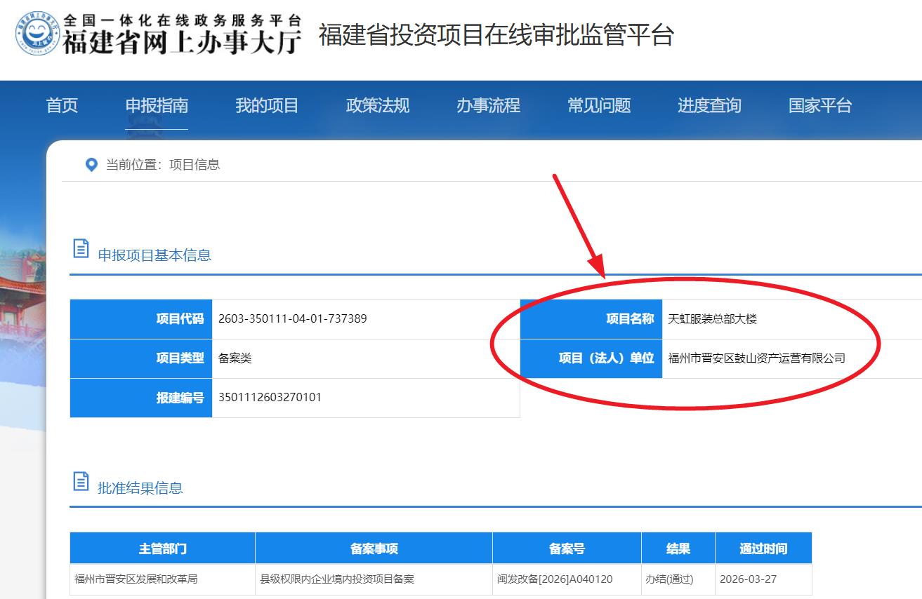 海西房产网(微信公众号:fjhxfcw)消息:福建省投资项目在线审批监管平台发布信息显示,“天虹服装总部大楼”已于2026年3月27日取得县级权限内企业境内投资项目备案,批准结果信息为办结(通过)。