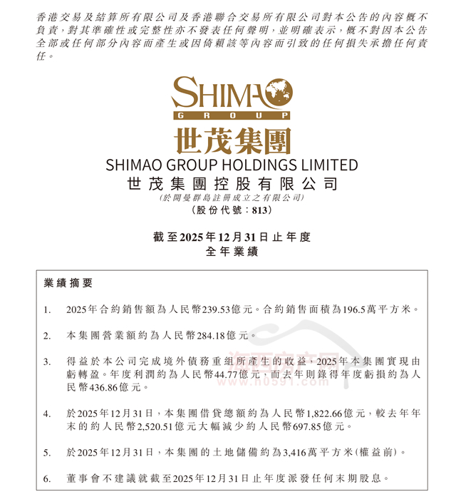 海西房产网(微信公众号:fjhxfcw)消息:3月27日,港股上市房企世茂集团控股有限公司发布2025年度业绩,全年实现净利润44.77亿元,相较2024年亏损436.86亿元实现大幅反转,成功扭亏为盈。