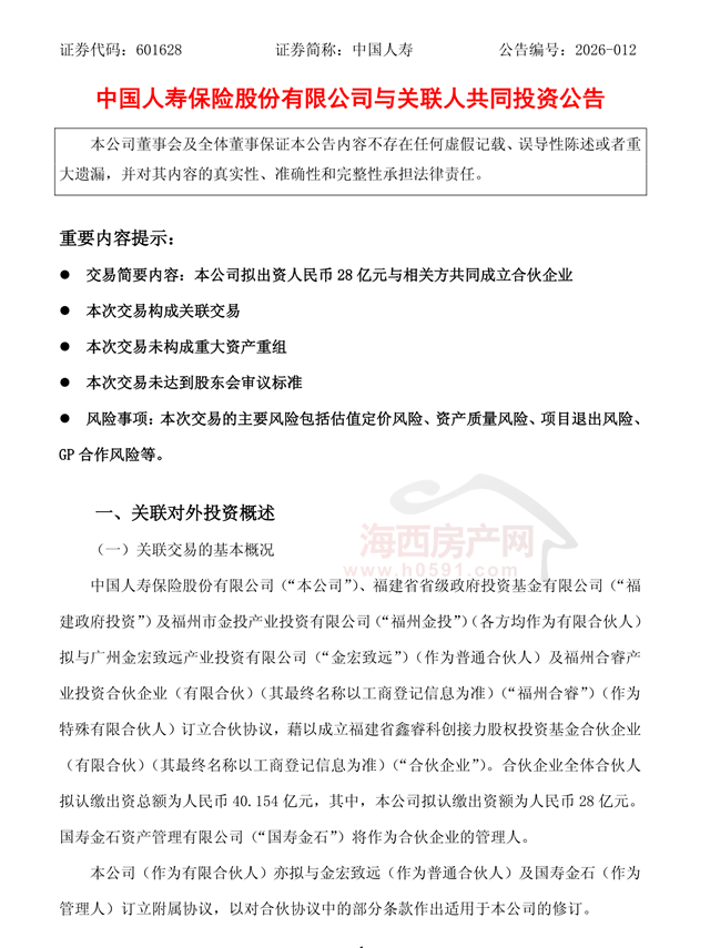 海西房产网(微信公众号:fjhxfcw)消息:3月25日,中国人寿保险股份有限公司发布一则与关联人共同投资公告。