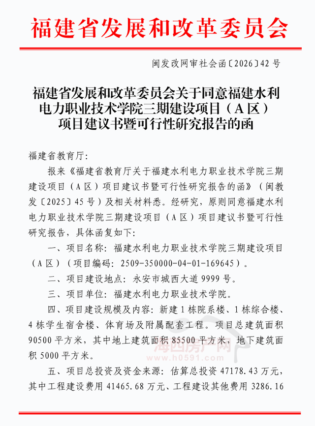 海西房产网(微信公众号:fjhxfcw)消息:3月27日,福建省发展和改革委员会发布“关于同意福建水利电力职业技术学院三期建设项目(A区)项目建议书暨可行性研究报告的函”。
