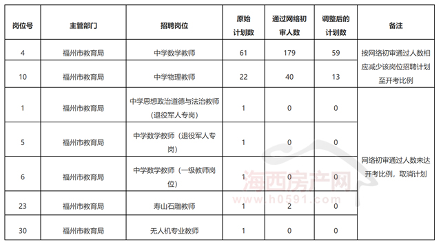 本次调整,中学数学教师原计划数为61人,报名通过网络初审人数179人,调整后的计划数为59人;中学物理教师原始计划数22人,报名40人,调整后的计划数为13人。