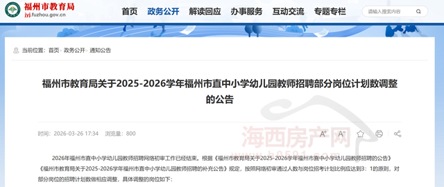 海西房产网(微信公众号:fjhxfcw)消息:3月26日,福州市教育局发布“关于2025-2026学年福州市直中小学幼儿园教师招聘部分岗位计划数调整的公告”。
