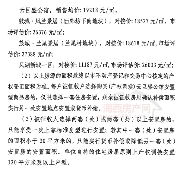 (2)以上房源的面积最终以市不动产登记和交易中心核定的产权登记面积为准。每户被征收户选择购买(产权调换)云巨盛公馆安置型商品房的,仅限选择一套住房安置,剩余被征收房屋确认补偿面积实行另一处安置地点安置或货币补偿。