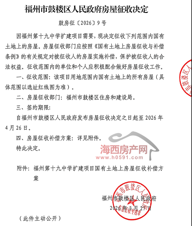 签约期限:自福州市鼓楼区人民政府发布房屋征收决定之日起至2026年4月26日。