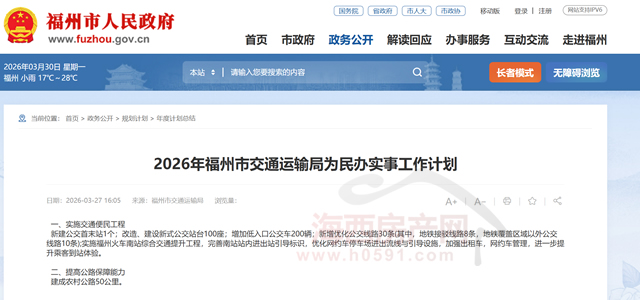 海西房产网(微信公众号:fjhxfcw)消息:3月27日,福州市交通运输局对外公布2026年为民办实事工作计划。