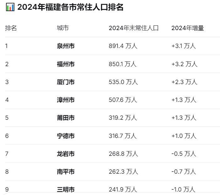 目前,2025年末福建全省常住人口为4190万人,户籍人口3960.75万人。暂无其它城市2025年的详细人口数据。