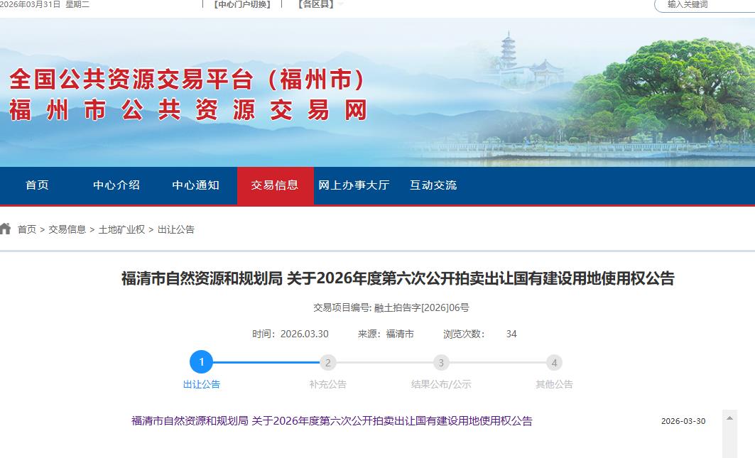 2026年3月30日,福清市自然资源和规划局发布“关于2026年度第六次公开拍卖出让国有建设用地使用权公告”。