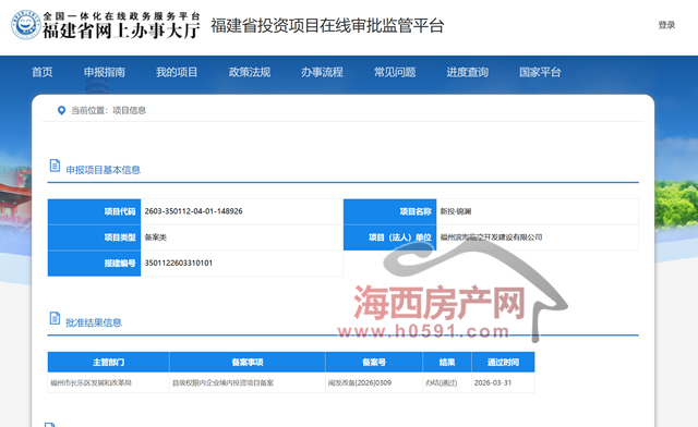 海西房产网(微信公众号:fjhxfcw)消息:福建省投资项目审批监管平台公布信息显示,长乐“新投·锦澜”已于3月31日通过备案报建。