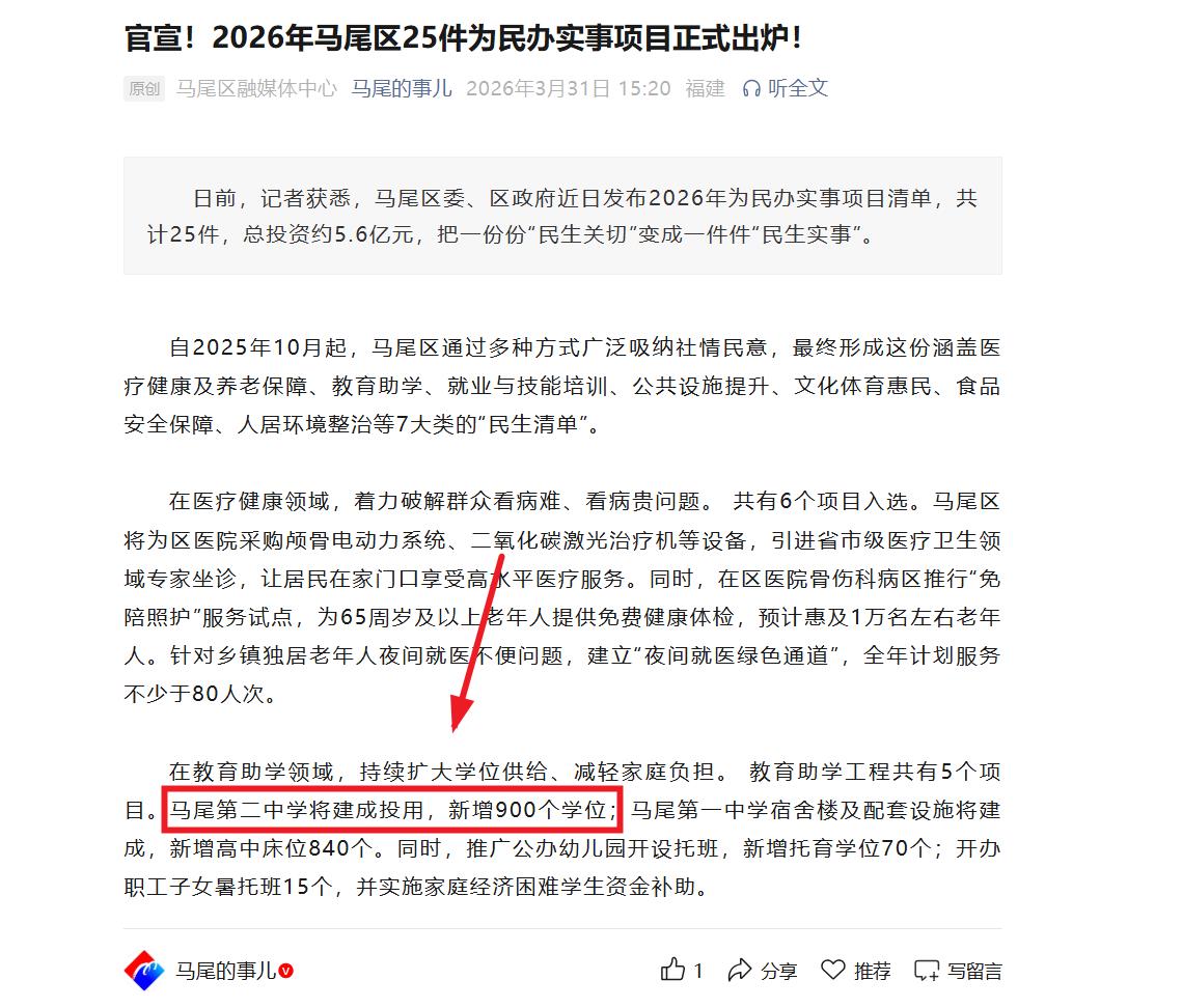 海西房产网(微信公众号:fjhxfcw)消息:2026年3月31日,马尾区融媒体中心发布“2026年马尾区25件为民办实事项目正式出炉!”。马尾区委、区政府近日发布2026年为民办实事项目清单,共计25件,总投资约5.6亿元,
