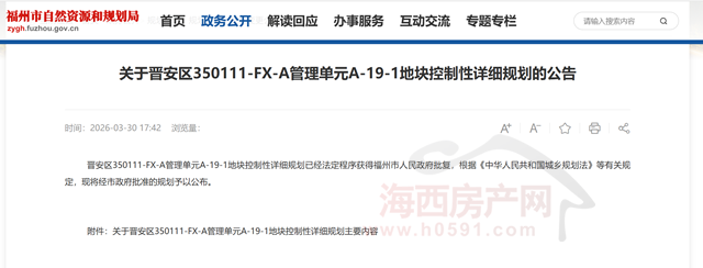 公告显示,晋安区350111-FX-A管理单元A-19-1地块控制性详细规划已经法定程序获得福州市人民政府批复,根据《中华人民共和国城乡规划法》等有关规定,现将经市政府批准的规划予以公布。