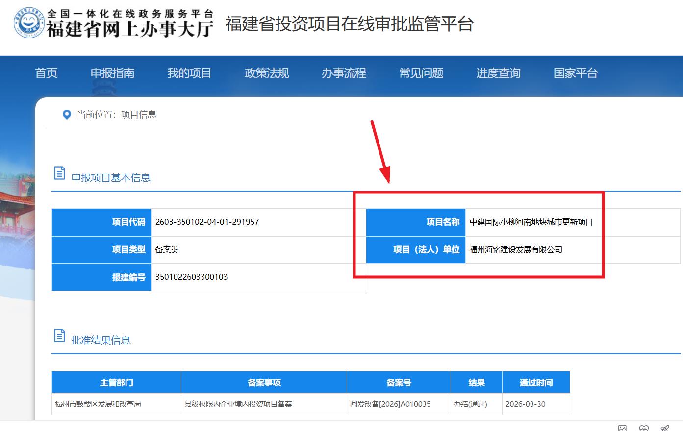海西房产网(微信公众号:fjhxfcw)消息:福建省投资项目在线审批监管平台发布信息显示,“中建国际小柳河南地块城市更新项目”已于2026年3月30日取得县级权限内企业境内投资项目备案,批准结果信息为办结(通过)。