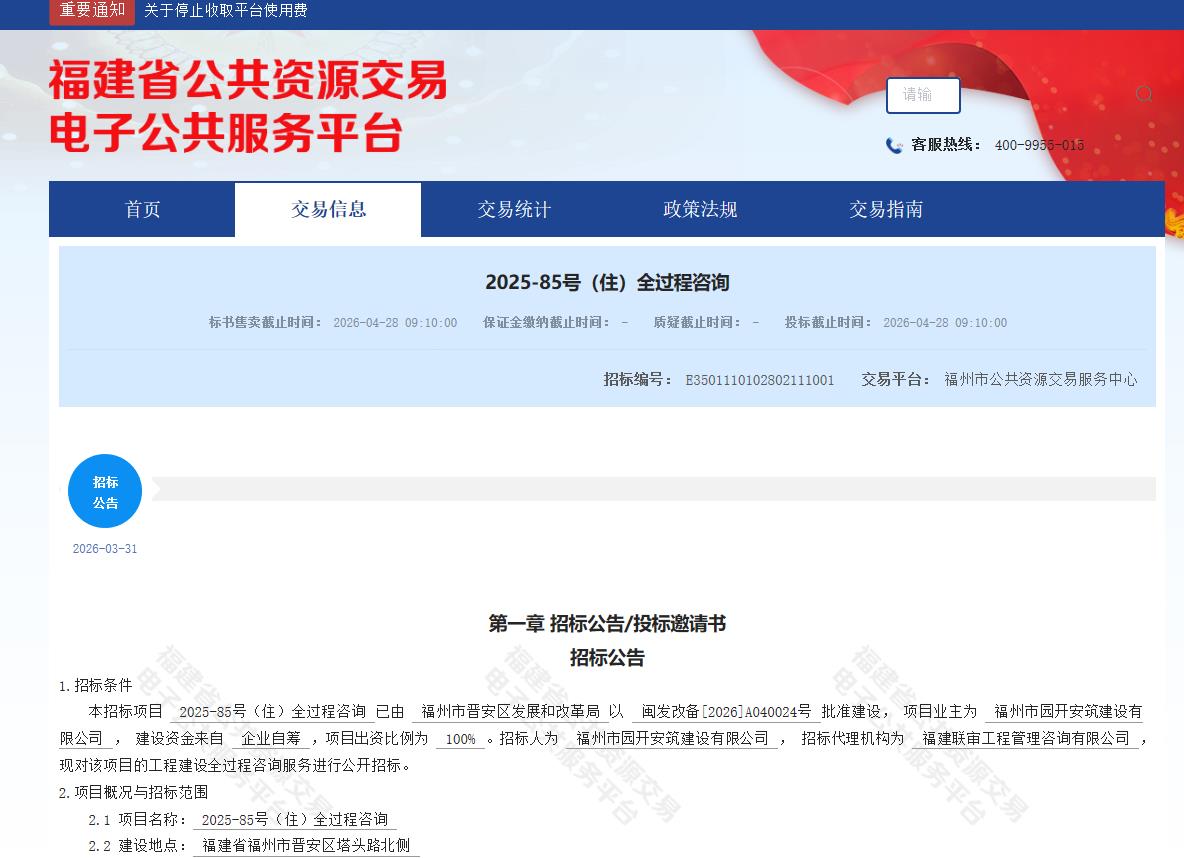 海西房产网(微信公众号:fjhxfcw)消息:2026年3月31日,福州市公共资源交易服务中心发布“2025-85号(住)全过程咨询”。