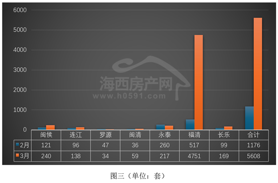 “福清”在购房补贴政策带动之下,3月签约套数高达4751套,环比前2月大幅增加4234套。
