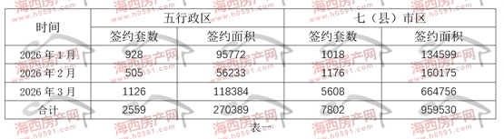 表一为2026年1-3月福州五行政区+七县(市)区住宅签约明细表。今年前3月福州五区住宅签约2559套、270389㎡,月均签约853套、90129.66㎡。