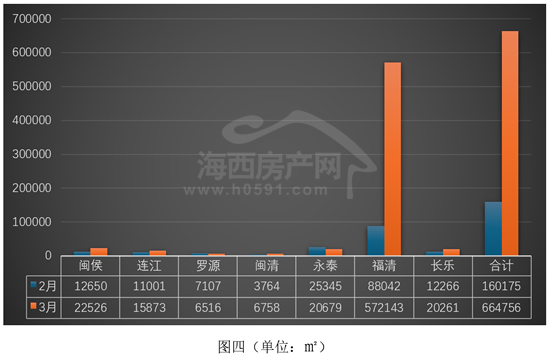 “闽侯”、“永泰”和“长乐”位列二到四位,3月签约面积分别报出22526㎡、20679㎡和20261㎡,环比2月两升一降。