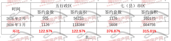 七县(市)区方面,3月签约5608套、664756㎡,环比2月大幅增加376.87%和315.01%。
