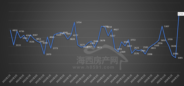 图一为2022年1月-2026年3月福州全市住宅签约变化趋势图。刚刚过去的3月,福州全市住宅签约6734套,环比2月大幅增加5053套,创下阶段新高。
