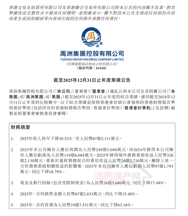 3月31日,港股上市房企禹洲集团控股有限公司公布截至2025年12月31日止年度业绩。